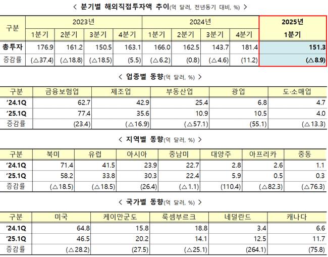 2025년 1분기 해외직접투자 151.3억 달러… 전년 대비 8.9% 감소 - 금융보험·광업은 증가… 제조·부동산·도소매 업종 위축 영향 - 대미 투자 28.2% 급감… “코로나 이전 수준 회귀 과정” 분석 - 정부 “통상환경 변화 대응 위해 기업지원·국가간 협력 지속”