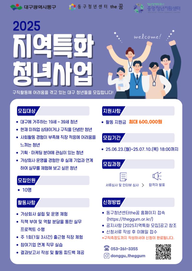 대구 동구청(구청장 윤석준)은 국무조정실 청년정책조정실과 (재) 청년재단 중앙청년지원센터가 주최하고 대구광역시청년센터가 주관한 ‘2025 지역특화 청년사업’ 공모에 최종 선정됐다.