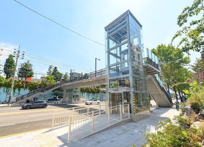 이에 구는 정밀안전진단을 실시하고 노후된 보도육교의 시설개선과 승강기 설치에 필요한 예산을 확보해 지난해 9월부터 보수공사를 본격 추진했다. 낡은 계단은 철거하고 보도육교 양편에 승강기 2대를 신설했으며, 육교 전면(397㎡)을 새로 도장하고 상부 교면은 탄성포장재로 재포장하는 등 육교의 기능과 편의성을 향상시키기 위한 전반적인 시설 개선이 이뤄졌다.