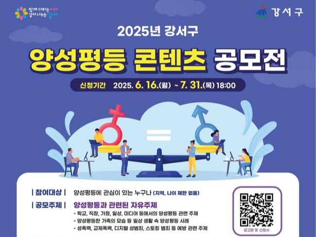 서울 강서구(구청장 진교훈)가 일상 속에서 성평등 문화를 확산시키고자 `2025 양성평등 콘텐츠 공모전`을 개최한다고 밝혔다.