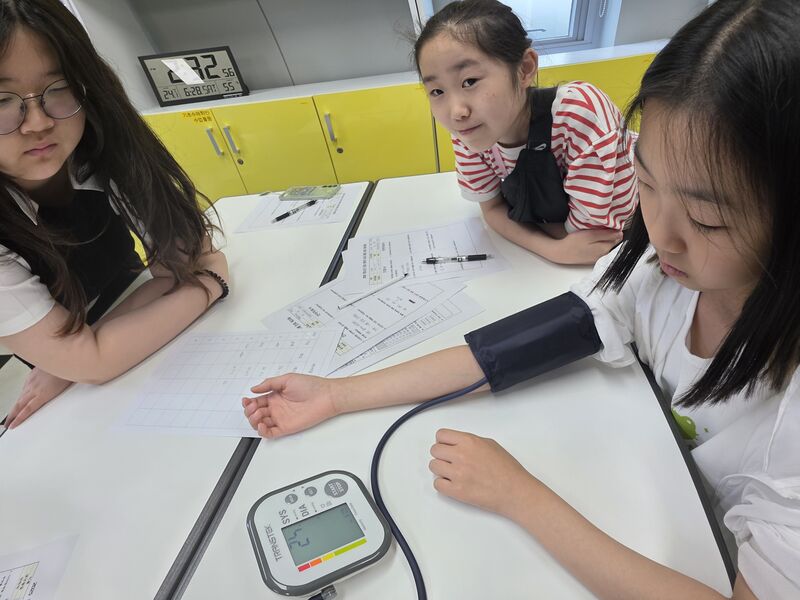 간호사 진로 체험. 참여 학생들이 혈압측정 체험을 하고 있는 모습. 달성군 제공.