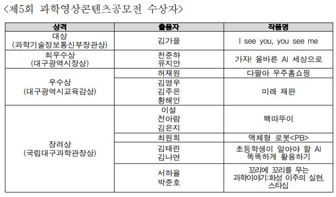 제5회 과학영상콘텐츠공모전 수상작은 국립대구과학관 공식 유튜브 채널 (https://www .youtube.com/@과학관)에서 확인할 수 있다.