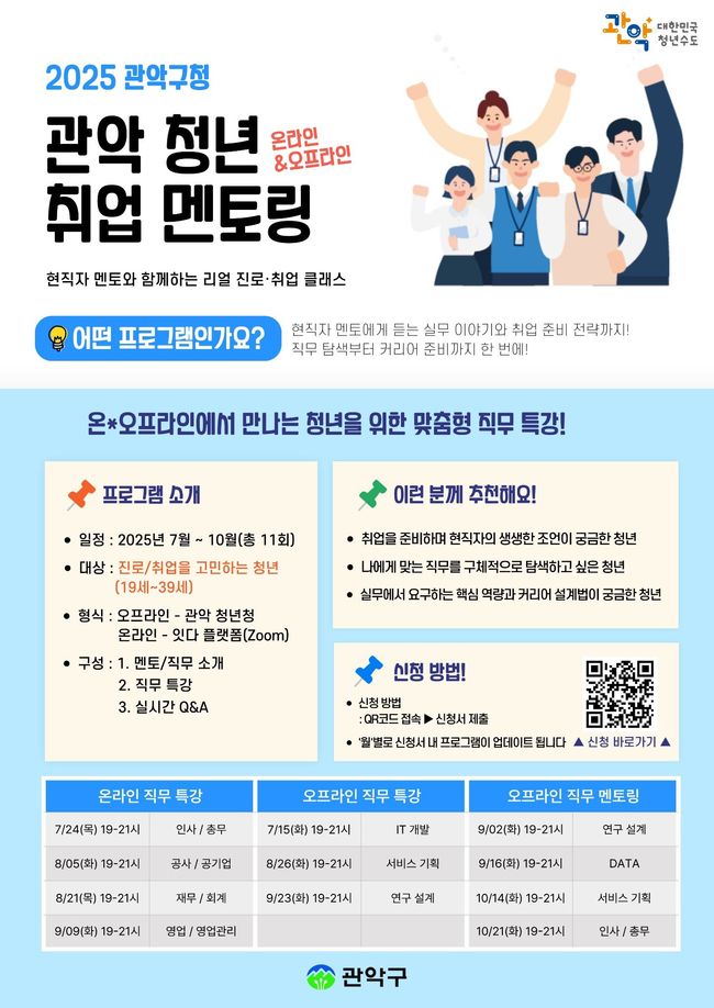 관악구, ‘2025 청년 취업멘토링’ 확대 개편…7월 15일부터 운영 - 삼성전자 연계 사업 확대…직무별 현직자 멘토링 11회 진행 - 인사·IT·기획 등 인기 직무 중심…취업 전략·자소서 첨삭까지 지원 - “청년 취업역량 강화와 진로 설정에 실질적 도움 기대”