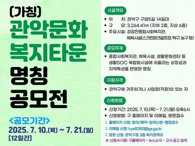 관악문화복지타운의 새 명칭 공모는 관악구에 주민등록 돼 있거나 사업장(직장), 학교 등이 위치한 생활권자라면 누구나 참여할 수 있다.
