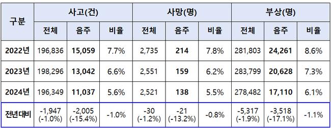 최근 음주운전 사고는 지속적인 단속과 홍보의 영향으로 눈에 띄게 감소했다. 지난해(2023년) 기준 음주운전 사고는 13,042건에서 올해(2024년) 11,037건으로 15.4% 줄었고, 사망자도 159명에서 138명으로 13.2% 감소했다.