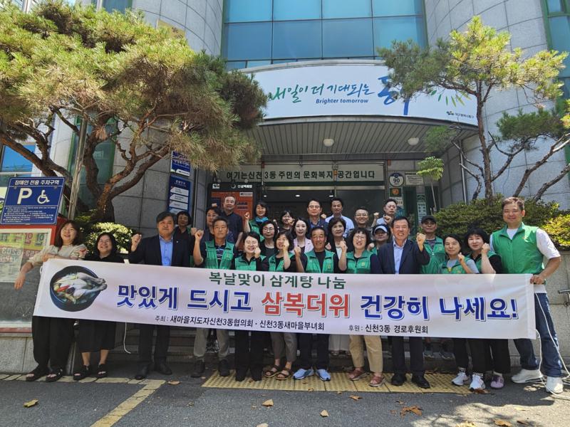 대구 동구 신천3동 새마을지도자협의회(회장 류명락) 및 새마을부녀회 (회장 김명옥)는 지난 10일, 신천3동 경로후원회(회장 류재룡)의 후원으로 건강한 여름나기를 위한 ‘사랑가득 삼계탕 나눔 행사’를 진 행했다.