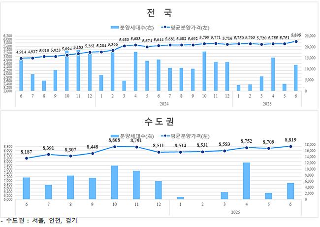2025년 6월말 기준 전국 민간아파트의 ㎡당 평균 분양가격은 5,895천원으로, 전월보다 2.5% 상승했으며 신규 분양세대수는 1만1,793세대로 전년 동월 대비 2,498세대 감소했다.