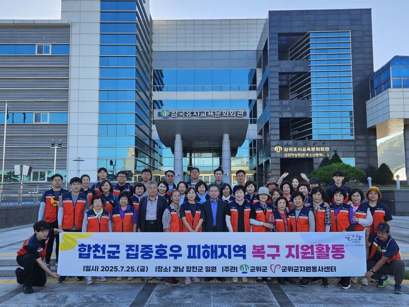 군위군(군수 김진열)은 7월25일, 최근 집중호우로 큰 피해를 입어 특별재난지역으로 지정된 경상남도 합천군에 민관합동 자원봉사단을 파견했다고 밝혔다. 이번 자원봉사 활동은 수해로 어려움을 겪는 이웃 지역 주민들에게 실질적인 도움을 제공하고, 신속한 피해 복구를 지원하기 위해 마련되었다.