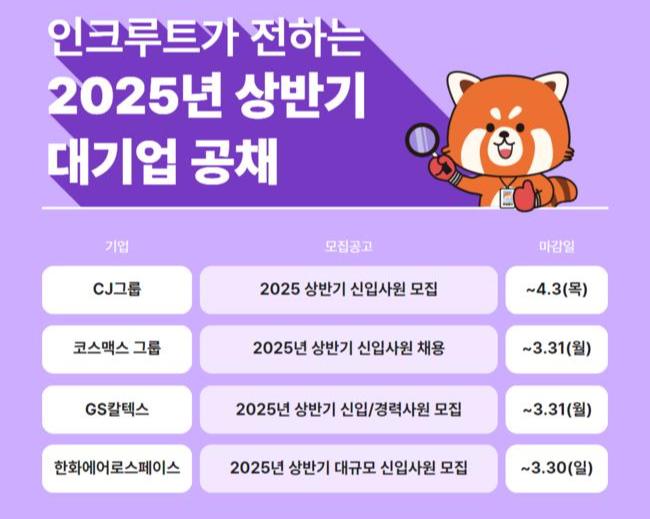 HR테크 기업 인크루트는 CJ그룹, GS칼텍스, 코스맥스, 한화에어로스페이스 등 주요 기업이 2025년 상반기 신입사원 채용을 진행한다고 19일 밝혔다.