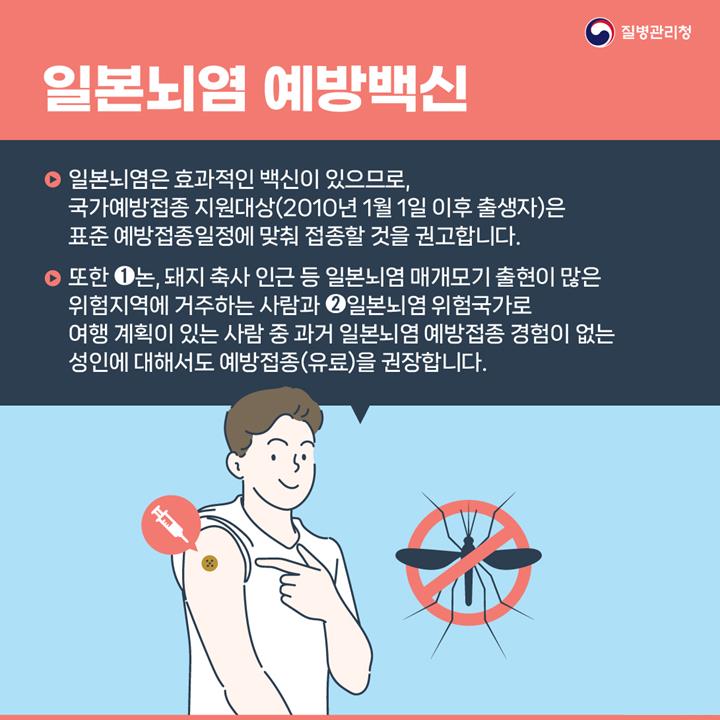 김태운 대구광역시 보건복지국장은 “지난달 우리 지역에서도 일본뇌염 매개 모기가 확인됨에 따라, 국가예방접종 대상 아동은 반드시 일본뇌염 예방접종을 완료해 주시기 바란다”며, “특히 휴가철 해외여행 시에는 해외유입 모기매개 감염병 예방수칙을 철저히 준수해 주실 것”을 당부했다.
