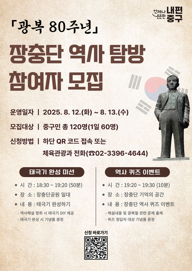 서울 중구(구청장)가 광복 80주년을 맞아 모든 세대가 함께 참여할 수 있는 ‘장충단 역사 탐방 프로그램’을 마련해 시민들에게 뜻깊은 역사 체험 기회를 제공한다.