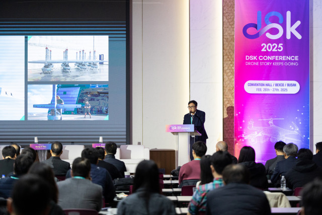 퀀텀에어로 이사회 전동근 의장이 드론쇼코리아 2025 컨퍼러스에서 연설을 하고 있다.