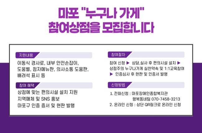 마포구의 무장애 상점 인증제인 `누구나 가게`와 연계해, 인증을 희망하는 상점을 대상으로 ▲이동식 경사로 ▲내부 안전손잡이 ▲도움벨 ▲점자메뉴판 ▲의사소통 도움판(AAC) ▲배려석 표시 등 다양한 무장애 편의시설 설치를 지원한다.