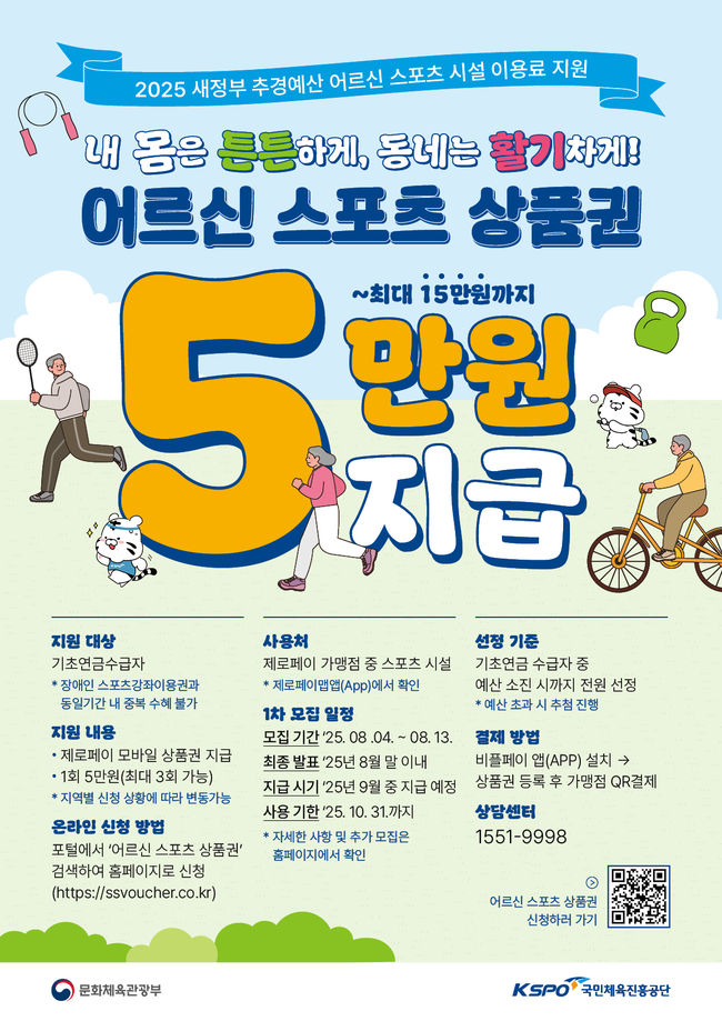 지원 대상자는 1인당 1회 5만 원씩 최대 3회, 총 15만 원까지 지원받는다. 신청은 8월 13일까지 ‘어르신 스포츠 상품권 전용 누리집(ssvoucher.co.kr)’에서 가능하다. 예산 초과 시 무작위 추첨으로 대상자를 선정한다.