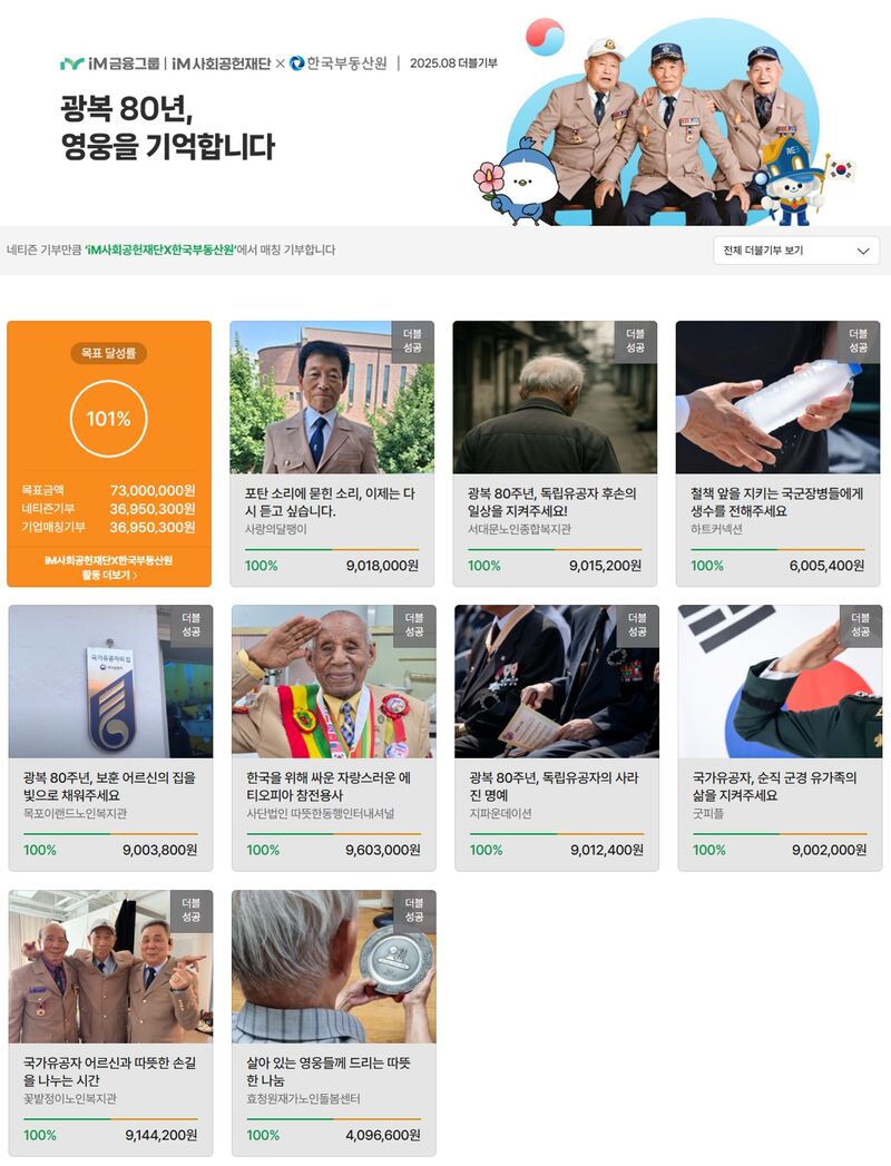 iM사회공헌재단 황병우 이사장은 “광복 80주년을 맞아 네티즌의 적극적인 참여로 의미 있는 성과를 이루게 됐으며, 보훈 대상자들에게도 실질적인 도움을 드릴 수 있게 돼 기쁘다”라며 “앞으로도 폭넓은 분야에서 참여형 사회공헌사업을 통한 ESG를 적극 실천하겠다”라고 말했다.