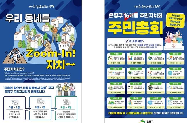 은평구(구청장 김미경)는 오는 23일부터 9월 27일까지 16개 동 주민센터에서 ‘2025년 은평구 주민자치회 동 주민총회’를 개최한다고 밝혔다.