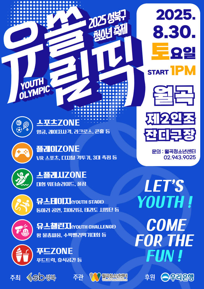유쏠림픽 홍보 포스터.성북구(구청장 이승로)가 지역 청소년들을 위해 준비한 대표 축제 ‘유쏠림픽(YOUTH OLYMPIC)’이 오는 8월 30일 오후 1시부터 월곡제2인조잔디구장에서 열린다. 이번 축제는 스포츠의 역동성과 여름 워터페스티벌의 시원함을 결합해 성북구만의 독창적인 청소년 참여형 행사로 기획됐다.