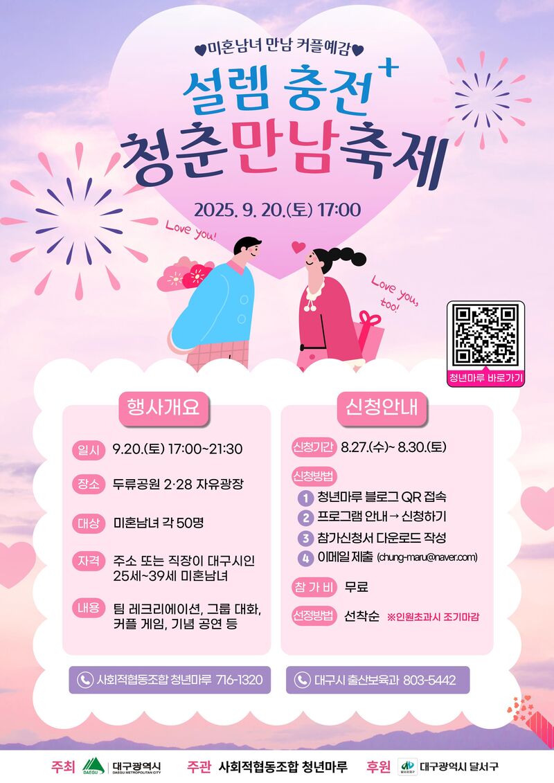 대구광역시는 오는 9월 20일(토) 오후 5시, 두류공원 2.28자유광장에서 올해 미혼남녀 만남 행사의 대미를 장식할 ‘청춘 만남 축제’를 개최한다.