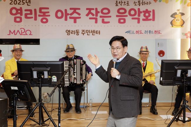 염리동 아주 작은 음악회에서 참여 악단에 감사 인사를 전하는 박강수 마포구청장.마포구(구청장 박강수)는 16개 동주민센터를 중심으로 주민이 공연장을 직접 찾지 않아도 문화예술을 향유할 수 있는 ‘아주 작은 음악회’를 운영하고 있다. 이번 음악회는 클래식, 국악, 가요, 트로트, 동요 등 다양한 장르로 구성돼 주민들에게 깊은 울림과 즐거움을 전한다.