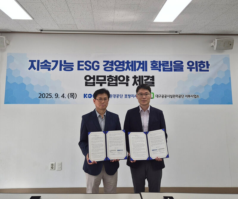 대구공공시설관리공단(이사장 문기봉) 서부사업소는 9월 4일(목) 해양환경공단 포항지사와 ‘지속가능성 확보 및 지역 상생발전을 위한 기후변화 대응과 ESG 경영’ 추진 업무협약(MOU)을 체결했다.