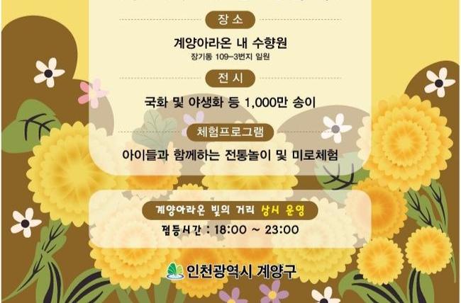 인천광역시 계양구(구청장 윤환)는 인천9경 계양아라온에서 오는 9월 20일부터 10월 31일까지 `가을꽃 국화축제`를 개최한다고 밝혔다.