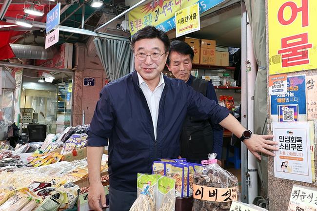 윤호중 행정안전부 장관이 지난 7월 24일 오후 서울 금천구 비단길 현대시장을 방문하여 민생회복 소비쿠폰 사용가능 매장 스티커를 부착하며 상인들을 격려하고 있다.