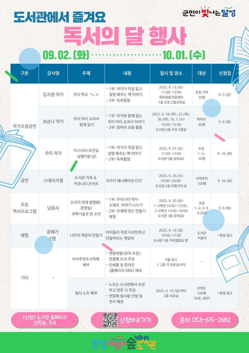 대구 달성어린이숲도서관이 ‘9월 독서의 달’을 맞아 지역 주민들이 책과 문화를 함께 즐길 수 있는 다채로운 프로그램을 마련했다.
