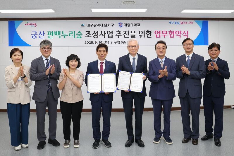 이태훈 달서구청장은 “협약을 통해 궁산 편백누리숲 조성사업이 속도감 있게 추진될 수 있도록 협조해 준 계명대학교에 감사드린다”며 “도시숲 조성을 지속 확대해 구민의 정주여건과 휴식의 품질을 높이겠다”고 말했다.