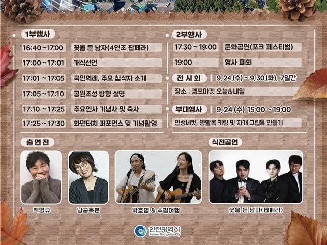 행사는 팝페라 4인조 `꽃을 든 남자`의 식전 공연으로 시작되며 이어 캠프마켓 공원 조성 방향에 대한 설명을 통해 시민들과 캠프마켓의 변화와 미래 계획을 공유한다.