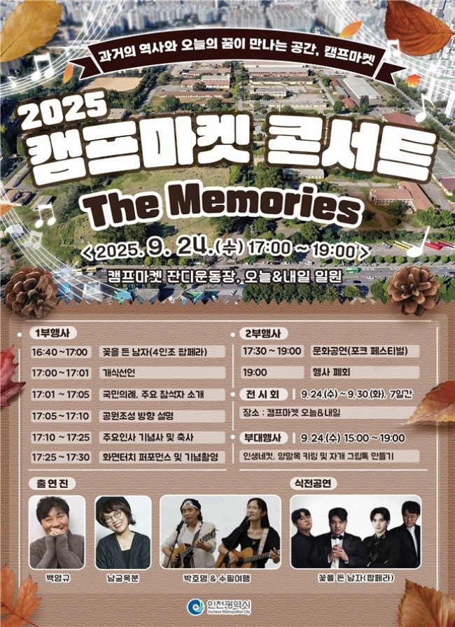 인천광역시(시장 유정복)는 오는 9월 24일 오후 5시, 부평 캠프마켓 개방 공간인 잔디운동장에서 `2025 캠프마켓 콘서트 The Memories`를 개최한다고 밝혔다.