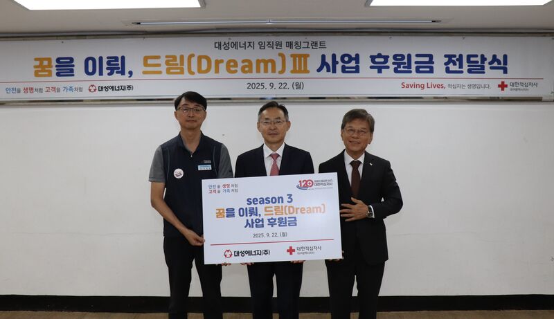 대성에너지(대표이사 박문희)는 22일(월) 중구 태평로 대한적십자사 대구광역지사를 방문해 임직원과 회사가 함께 조성한 매칭그랜트 후원금 3,600만원을 「꿈을 이뤄, 드림(Dream) 시즌3」 지원금으로 전달했다.