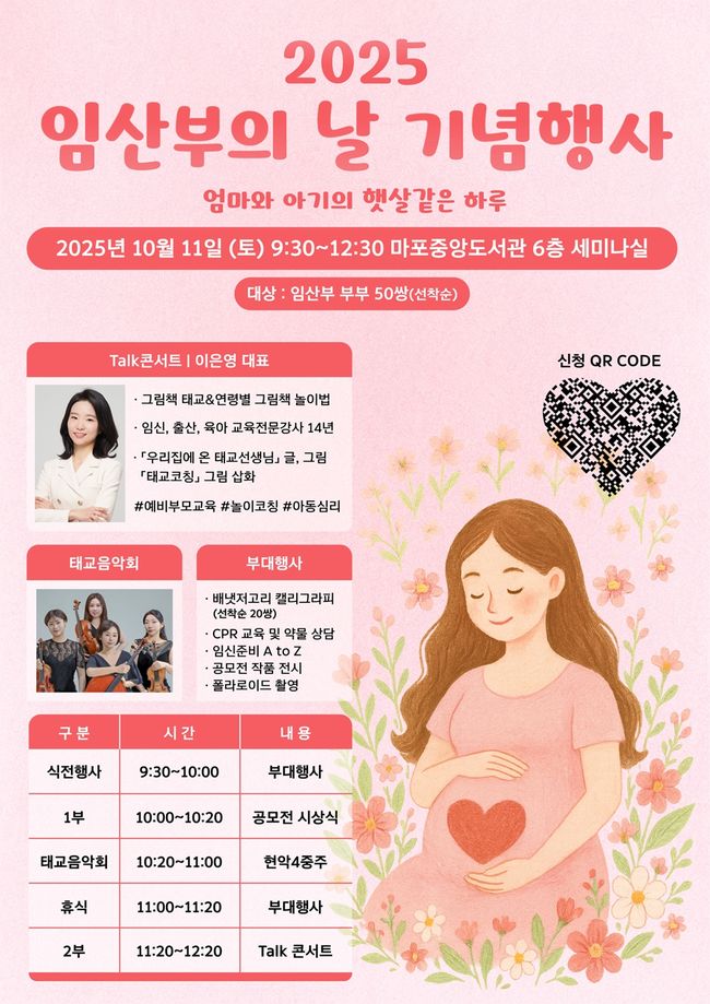 마포구 2025 임산부의 날 기념행사 포스터.오는 10월 11일 토요일 오전 9시 30분, 마포중앙도서관에서 ‘엄마와 아기의 햇빛같은 하루’ 행사가 열린다. 마포구민 임신부와 배우자(가족) 총 50쌍(100명)을 대상으로 참가 신청을 받으며, 신청은 9월 28일까지 행사 포스터 내 QR코드를 통해 온라인으로 접수 가능하고 선착순 마감된다.