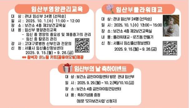행사는 금천구에 등록된 임산부를 대상으로 진행된다. ▲ 임신기간 영양 관리교육 ▲ 플라워태교 체험 ▲ 보건소 내소자 축하 이벤트 ▲ 건강 프로그램 등 다양한 내용으로 구성된다.