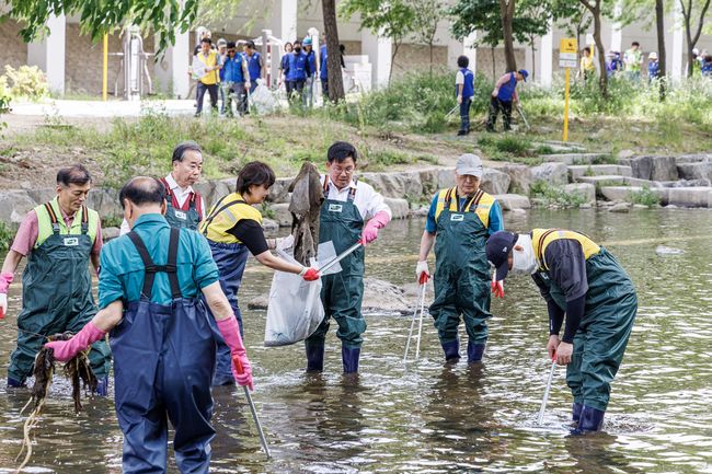 박강수 마포구청장이 하천 정화 활동을 펼치고 있다.
