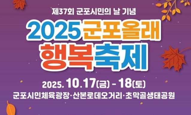 2025 군포올래행복축제는 10월 17일 금요일부터 시민체육광장에서 아나운서 신영일의 사회로 코요태, 김수찬, 진해진 등 유명 가수의 출연 및 지역예술인의 댄스 퍼포먼스와 환상적인 불꽃쇼로 시민들에게 행복한 시간을 선물한다.