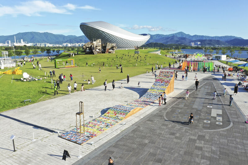 방문객들이 강정보 광장에서 열린 ‘2025 달성 대구현대미술제’ 야외 전시를 여유롭게 감상하고 있다. 달성군 제공.