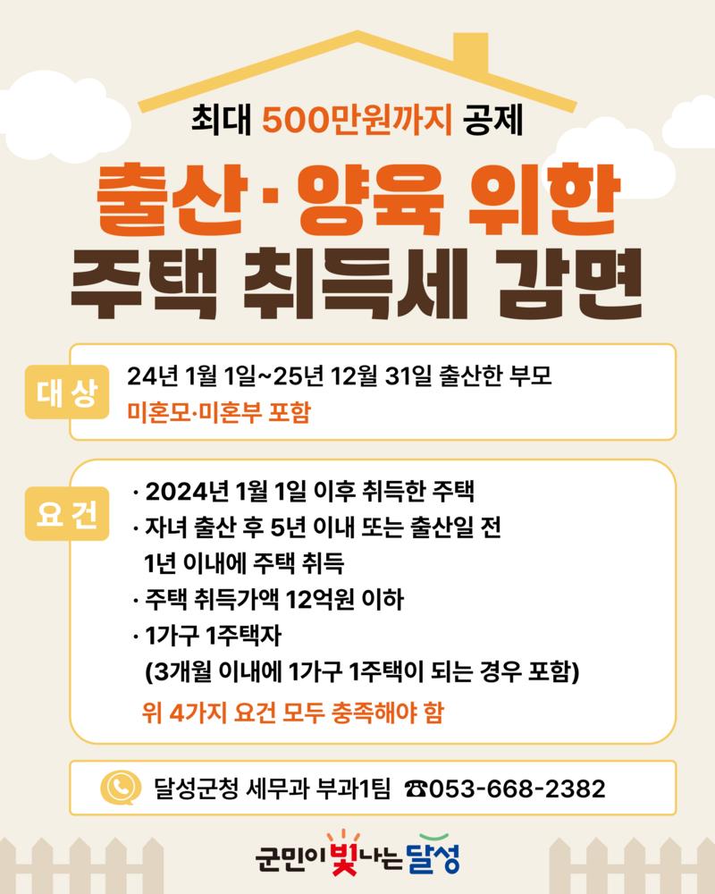 대구 달성군(군수 최재훈)은 출산·양육 가구가 주택 구매 시 취득세를 최대 500만 원까지 감면받을 수 있는 제도를 운영하며, 대상 가구가 혜택을 놓치지 않도록 적극 홍보에 나섰다.
