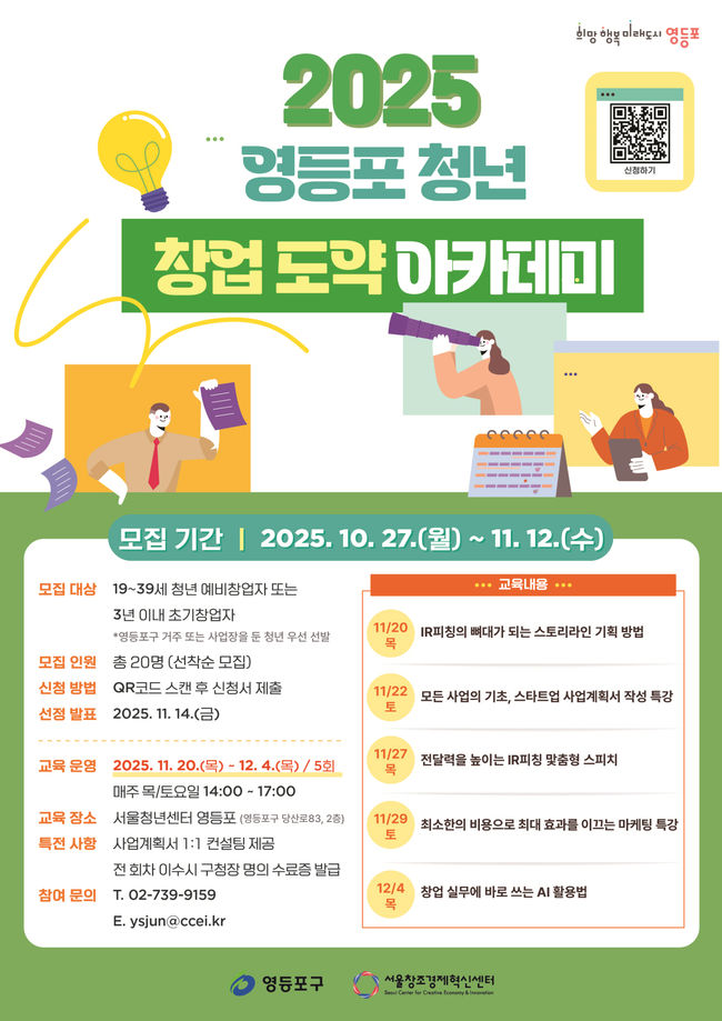 영등포구, ‘청년 창업 도약 아카데미’ 참가자 모집 - 창업 3년 이내 청년 대상 실무 중심 창업 교육 - 11월 20일부터 12월 4일까지 총 5회 무료 운영 - 사업계획서 상담·AI 활용법 등 맞춤형 실전 프로그램