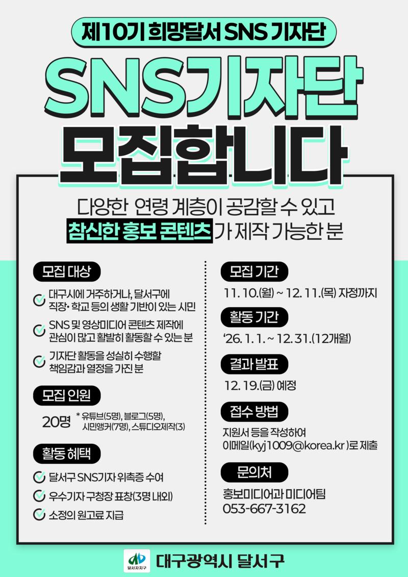 대구 달서구(구청장 이태훈)는 구민이 직접 참여해 지역의 소식을 생생하게 전하는 제10기 ‘희망달서 SNS기자단’을 오는 **12월 11일(목)**까지 모집한다.