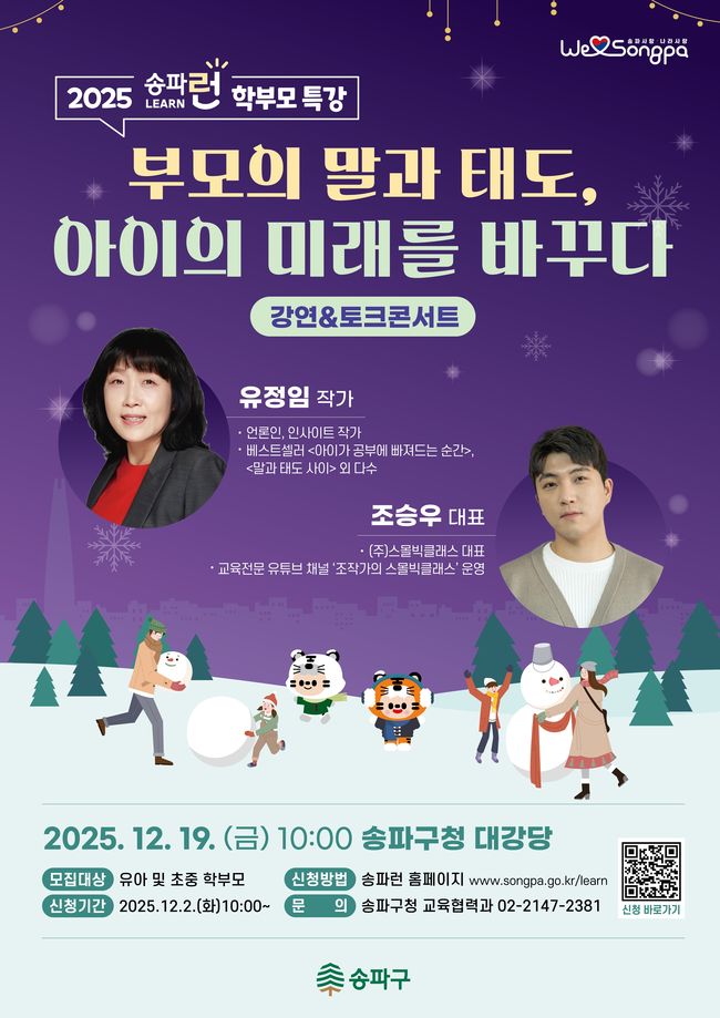 “부모의 말과 태도가 아이의 미래를 바꾼다”... 송파구, 올해 마지막 학부모 특강 개최 - 교육전문가 2인 강연과 토크콘서트 구성 - 사전 설문으로 학부모 질문 반영 - 양육 역량 강화 위한 연중 프로그램 호응