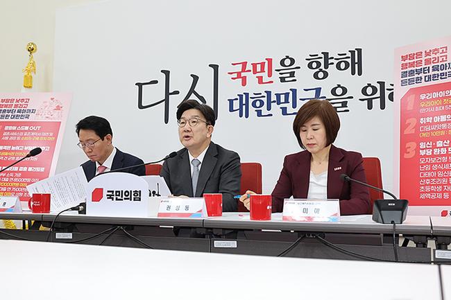 권성동 원내대표와 김상훈 정책위의장은 23일 오전 서울 여의도 국회 원내대표실에서 결혼 준비 과정에서의 불공정을 바로잡고 임신과 출산에 대한 복지 혜택을 늘리는 공약을 발표하고 있다.