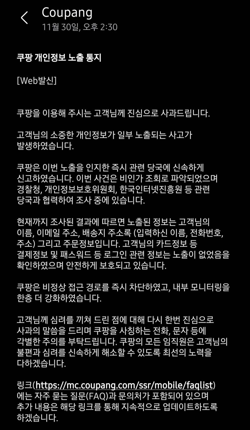 쿠팡 개인정보 노출 통지 알림 문자.