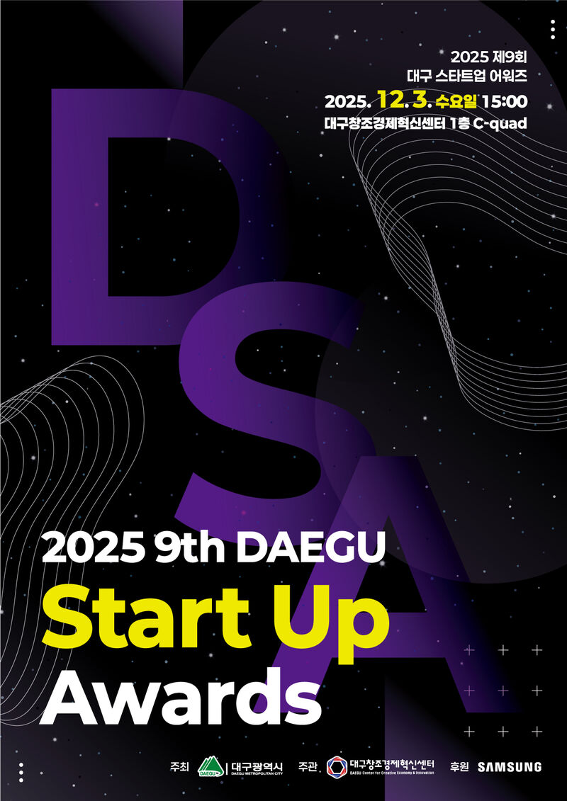 대구광역시는 12월 3일(수) 오후 3시, 대구창조경제혁신센터 C-quad(1층)에서 ‘제9회 대구스타트업어워즈’를 개최하고, 지역 창업생태계를 빛낸 우수 스타트업 10개사와 창업지원 유공자 2명을 시상한다.