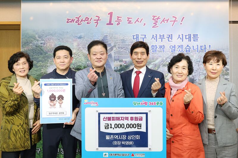 이태훈 달서구청장은 “산불 피해로 어려움을 겪고 있는 이웃들을 위해 따뜻한 마음을 나누어 주신 월촌역시장상인회에 깊이 감사드린다”며 “기탁해 주신 성금은 산불 피해 지역 주민들에게 도움이 될 수 있도록 잘 전달하겠다”고 밝혔다.
