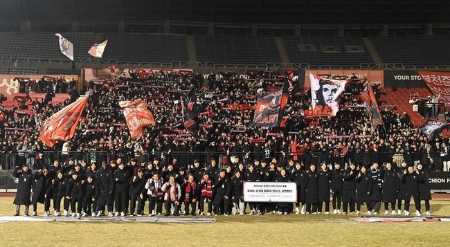 부천FC1995 K리그1 승격을 축하하며 선수단과 헤르메스가 단체 기념사진을 촬영했다.15일 부천시는 부천FC1995가 최근 열린 수원FC와의 K리그 승강 플레이오프에서 1차전 1-0, 2차전 3-2로 연승을 거두며 합계 4-2로 승리해 1부리그 승격에 성공했다고 밝혔다. 2007년 시민과 팬의 힘으로 창단한 이후 18년 만에 처음 밟는 K리그1 무대다.