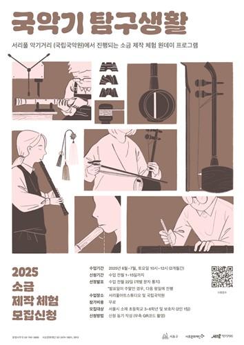 올해 `국악기 탐구생활`은 작년보다 규모를 약 두 배 확대해 총 224명(112팀)을 모집한다. 서울시 초등학교 3~6학년 학생과 학부모가 2인 1팀으로 신청할 수 있으며, 참가비는 전액 무료다. 신청은 수업 전월 1일부터 15일까지 온라인으로 진행되며, 참여 동기를 정성껏 작성한 팀이 우선 선정된다. 자세한 내용은 서리풀 악기거리 홈페이지에서 확인할 수 있다.