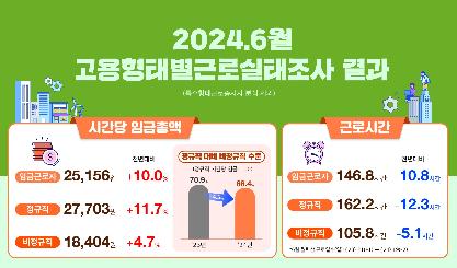 고용노동부는 29일 `2024년 6월 고용형태별근로실태조사` 결과를 발표하고, 비정규직의 시간당 임금총액이 정규직의 66.4%에 그쳐 전년보다 격차가 확대됐다고 밝혔다.