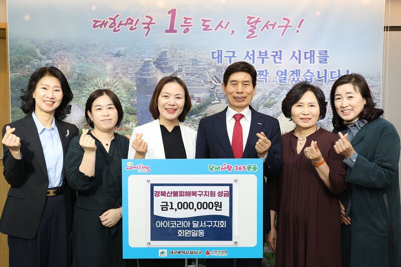 대구 달서구(구청장 이태훈)는 아이코리아 달서구지회(회장 안영란)로부터 산불 피해지역 지원을 위한 후원금 100만 원을 기탁받았다고 28일 밝혔다.