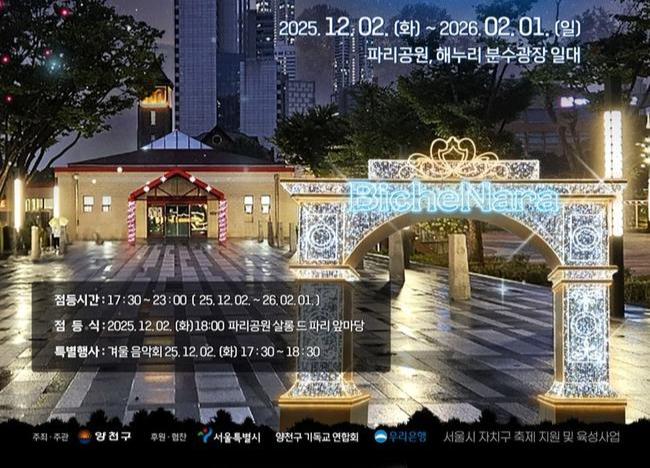 양천구(구청장 이기재)는 연말연시를 맞아 구민에게 따뜻한 감성과 환상적인 볼거리를 선사하기 위해 11월 28일부터 2026년 2월 1일까지 파리공원과 해누리분수광장에서 `2025 양천 비체나라 페스티벌`을 개최한다고 밝혔다.