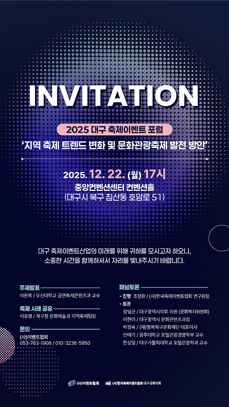 (사)이벤트협회와 (사)한국축제이벤트협회 대구·경북지회는 오는 12월 22일(월) 오후 5시, 대구 북구 침산동에 위치한 중앙컨벤션센터 컨벤션홀에서 「2025 대구 축제이벤트 포럼」을 개최한다.